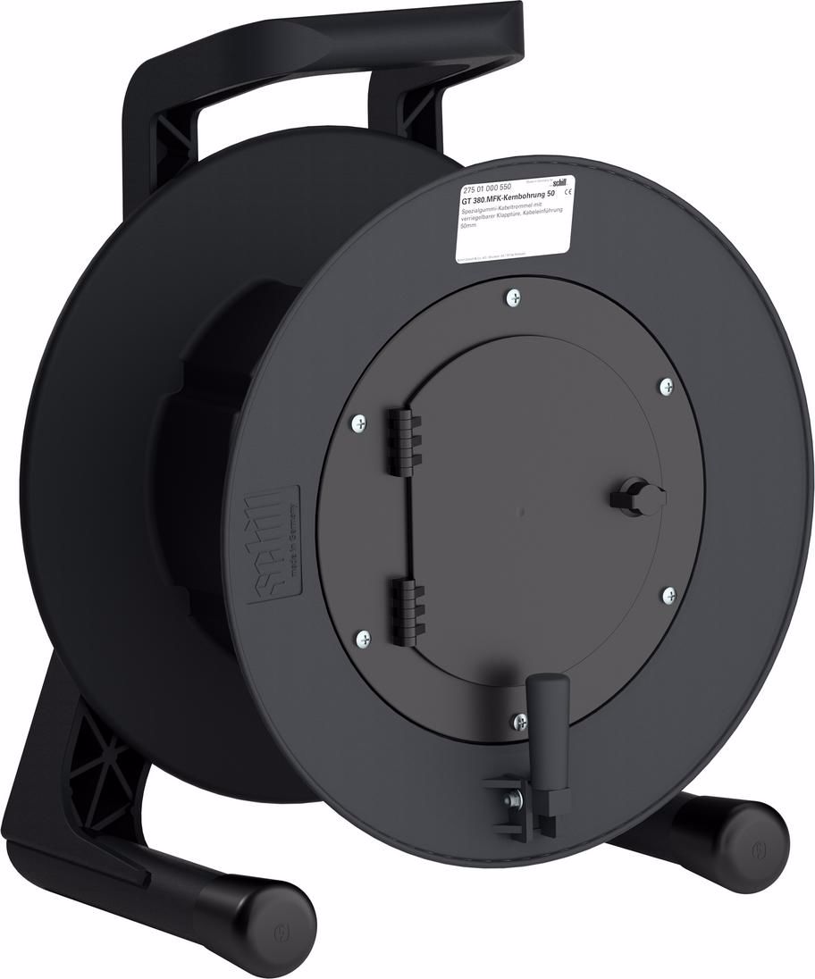 Cable drum made of speciality rubber, with lockable door (2 hinges) with hole in the core: cable entry with diameter of 50mm